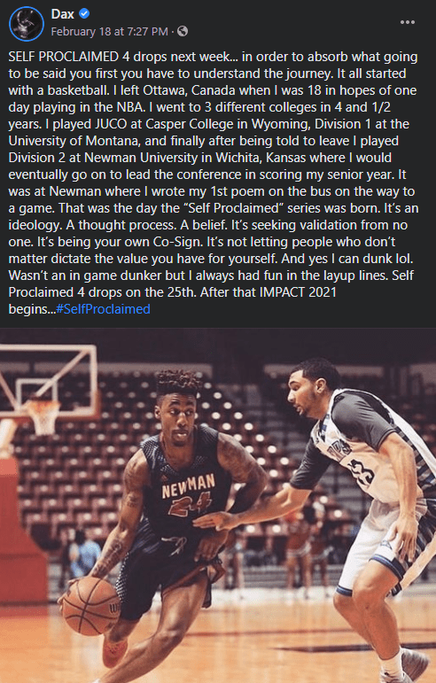 “”SELF PROCLAIMED 4 drops next week… in order to absorb what going to be said you first you have to understand the journey. It all started with a basketball. I left Ottawa, Canada when I was 18 in hopes of one day playing in the NBA. I went to 3 different colleges in 4 and 1/2 years. I played JUCO at Casper College in Wyoming, Division 1 at the University of Montana, and finally after being told to leave I played Division 2 at Newman University in Wichita, Kansas where I would eventually go on to lead the conference in scoring my senior year. It was at Newman where I wrote my 1st poem on the bus on the way to a game. That was the day the “Self Proclaimed” series was born. It’s an ideology. A thought process. A belief. It’s seeking validation from no one. It’s being your own Co-Sign. It’s not letting people who don’t matter dictate the value you have for yourself. And yes I can dunk lol. Wasn’t an in game dunker but I always had fun in the layup lines. Self Proclaimed 4 drops on the 25th. After that IMPACT 2021 begins…#SelfProclaimed“”